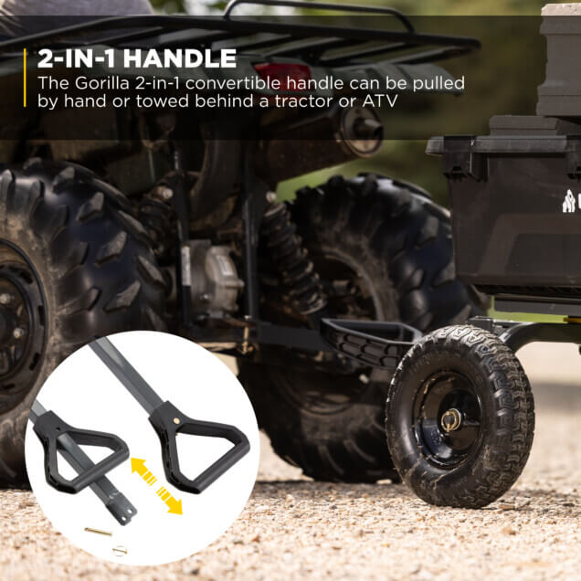 • Patented 2-in-1 handle allows cart to be towed behind a lawn tractor or ATV or pulled easily by hand
