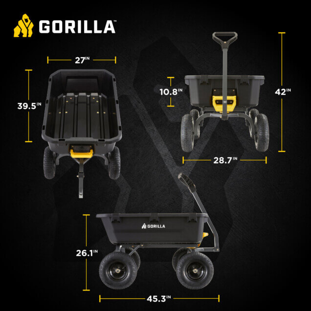 1. For years I’ve used various types of wheel barrels, at home and for for a part time business. I’m still very active as a senior member of society, always searching for ways to be able to continue performing outside projects. After reviewing the Gorilla 7 cu cart features, I decided to acquire the product. Great choice! Easy assembly and handles extremely well. Just finish a back yard project requiring stone removal and new mulch applied. Manually pulled very easily and even attached quickly to a club cart and JD tractor. The individuals helping with the project were on their phones searching for available units for themselves. Proof of utility and functionality. Gave the older wheel barrels away.