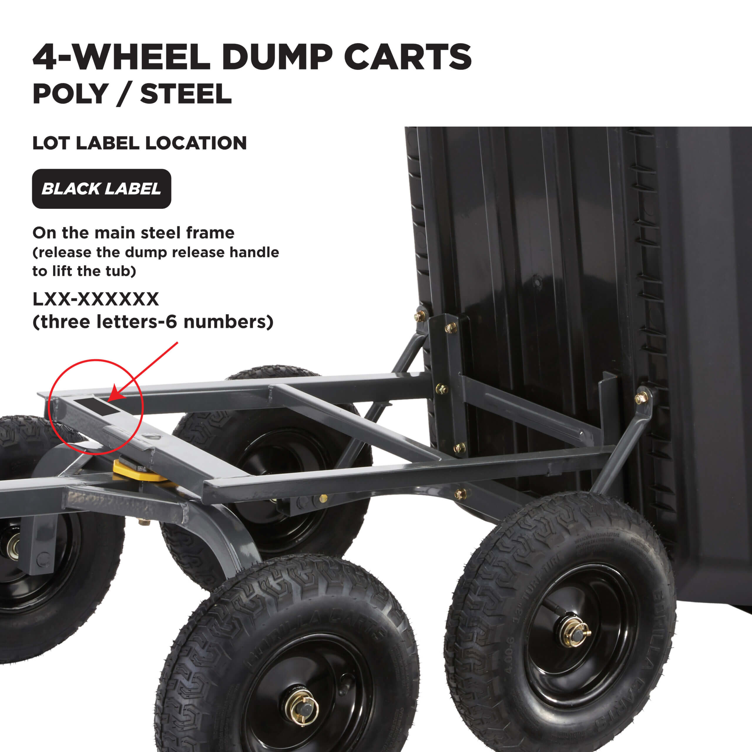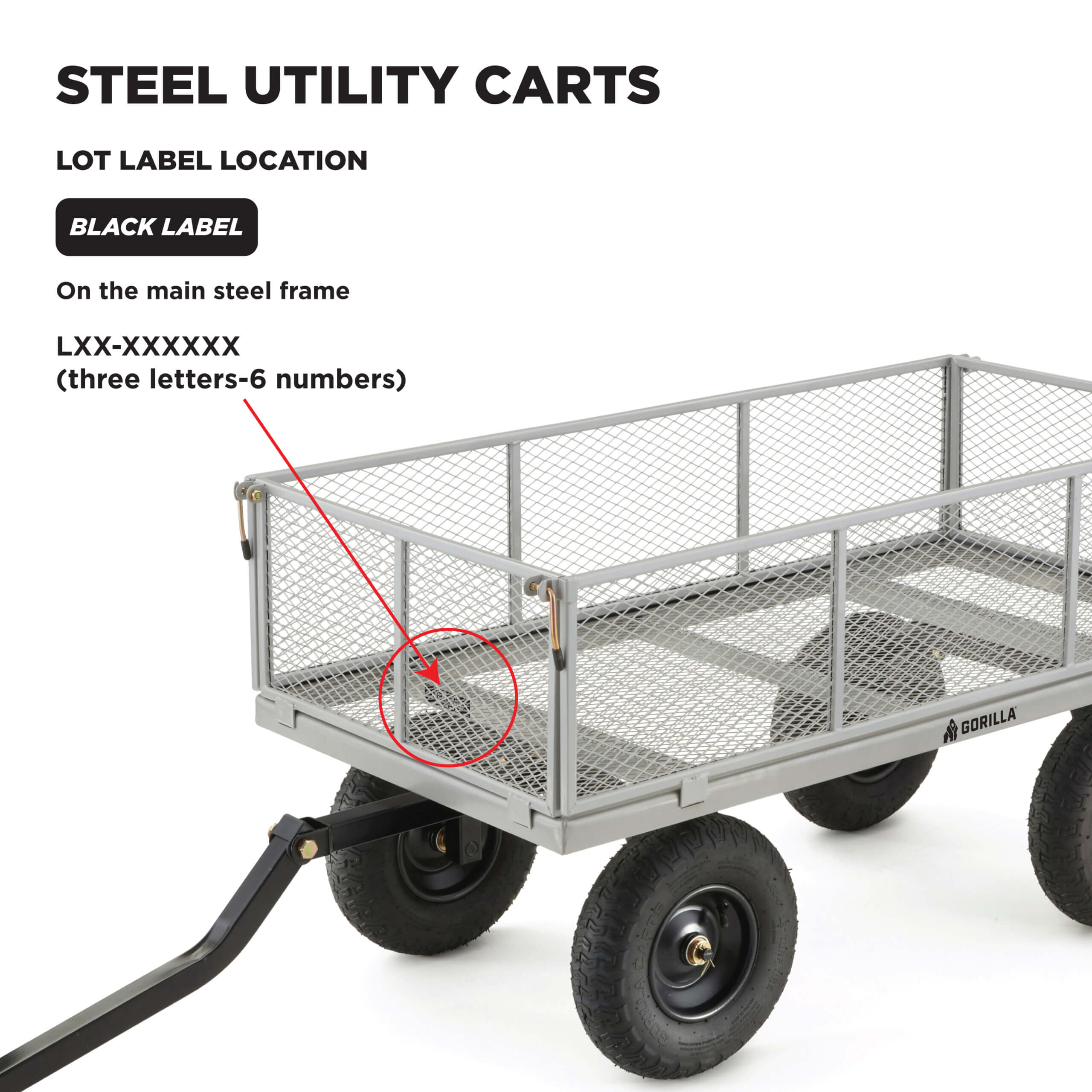 Gorilla® Carts are warranted against defects in workmanship or materials, under normal use, to the original owner for 1-year after date of purchase.